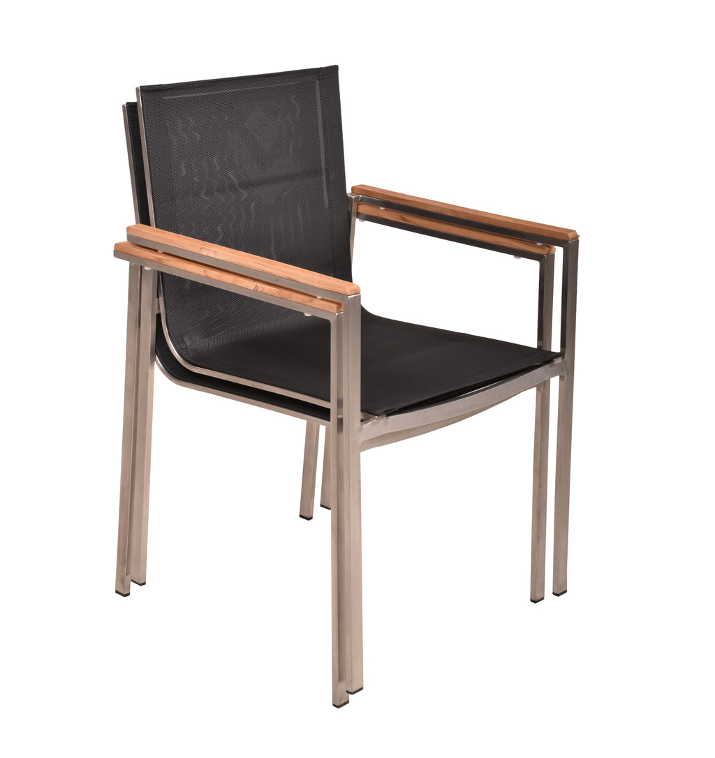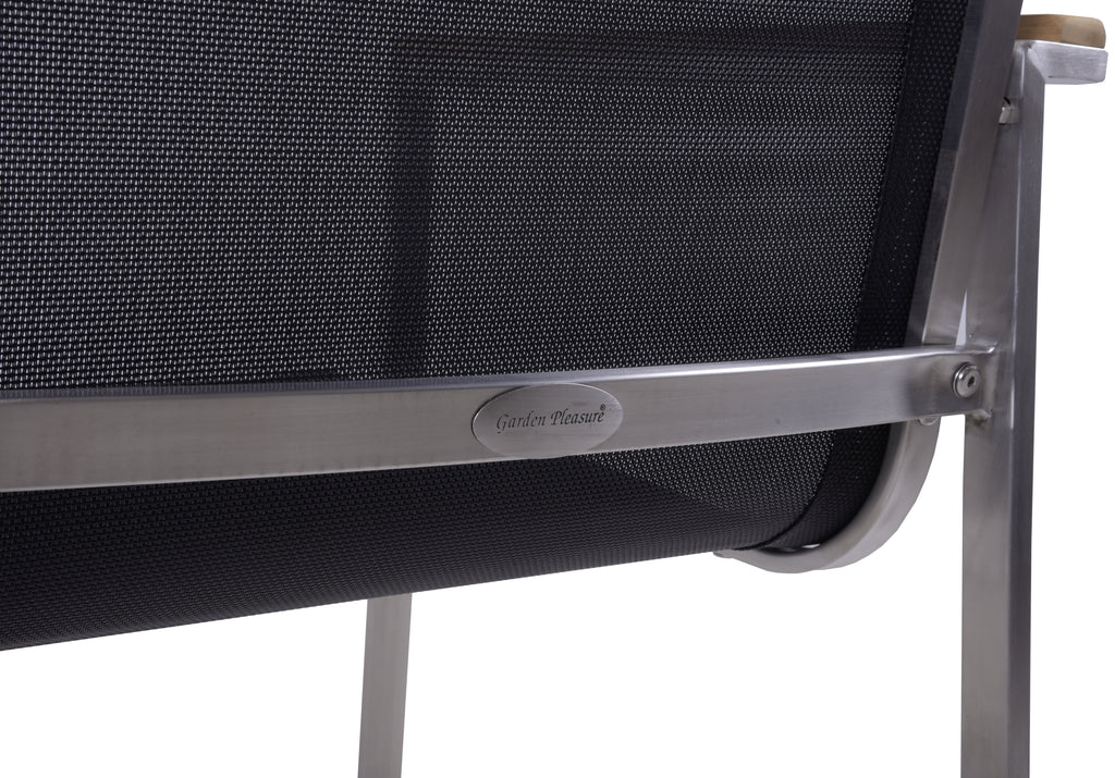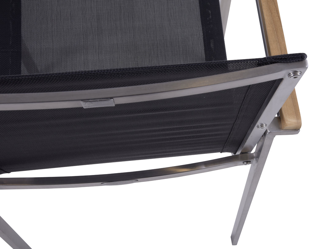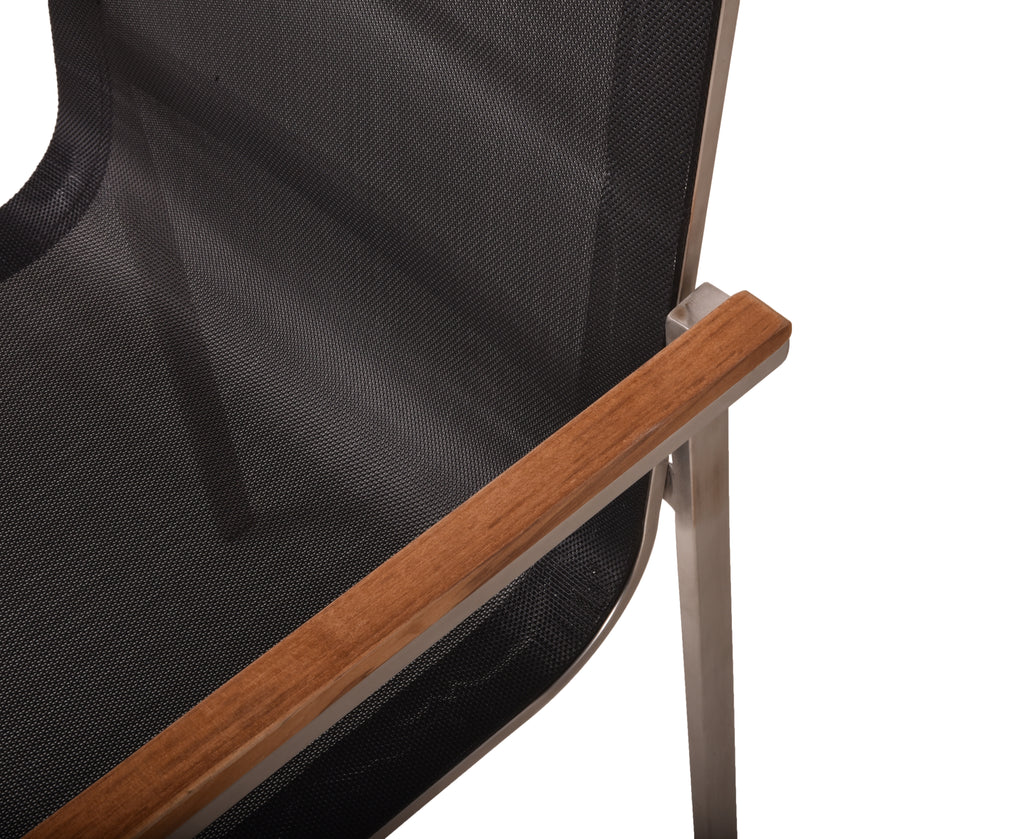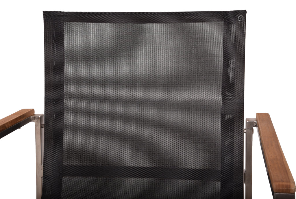Die Materialqualität ist auf Langlebigkeit ausgelegt: Das Gestell aus gebürstetem Edelstahl 304 ist robust und rostfrei. Die Armlehnen aus FSC-zertifiziertem Teakholz bieten eine angenehme Auflagefläche, während das strapazierfähige Kunststoffgewebe absolut wetterfest ist.