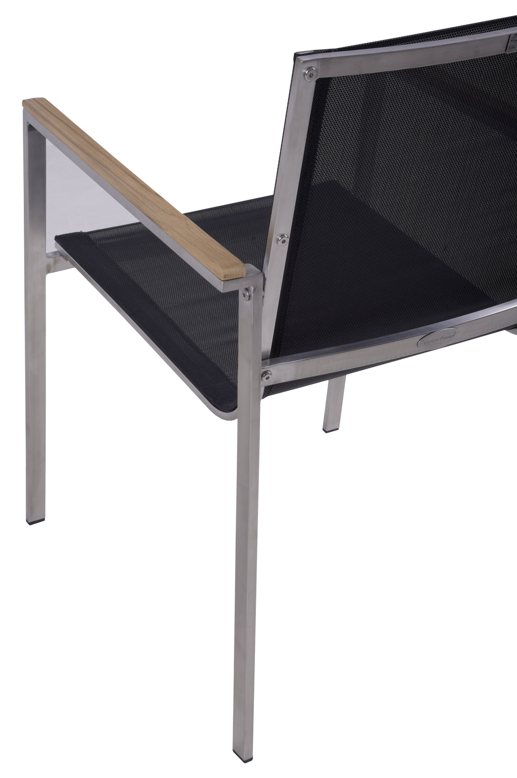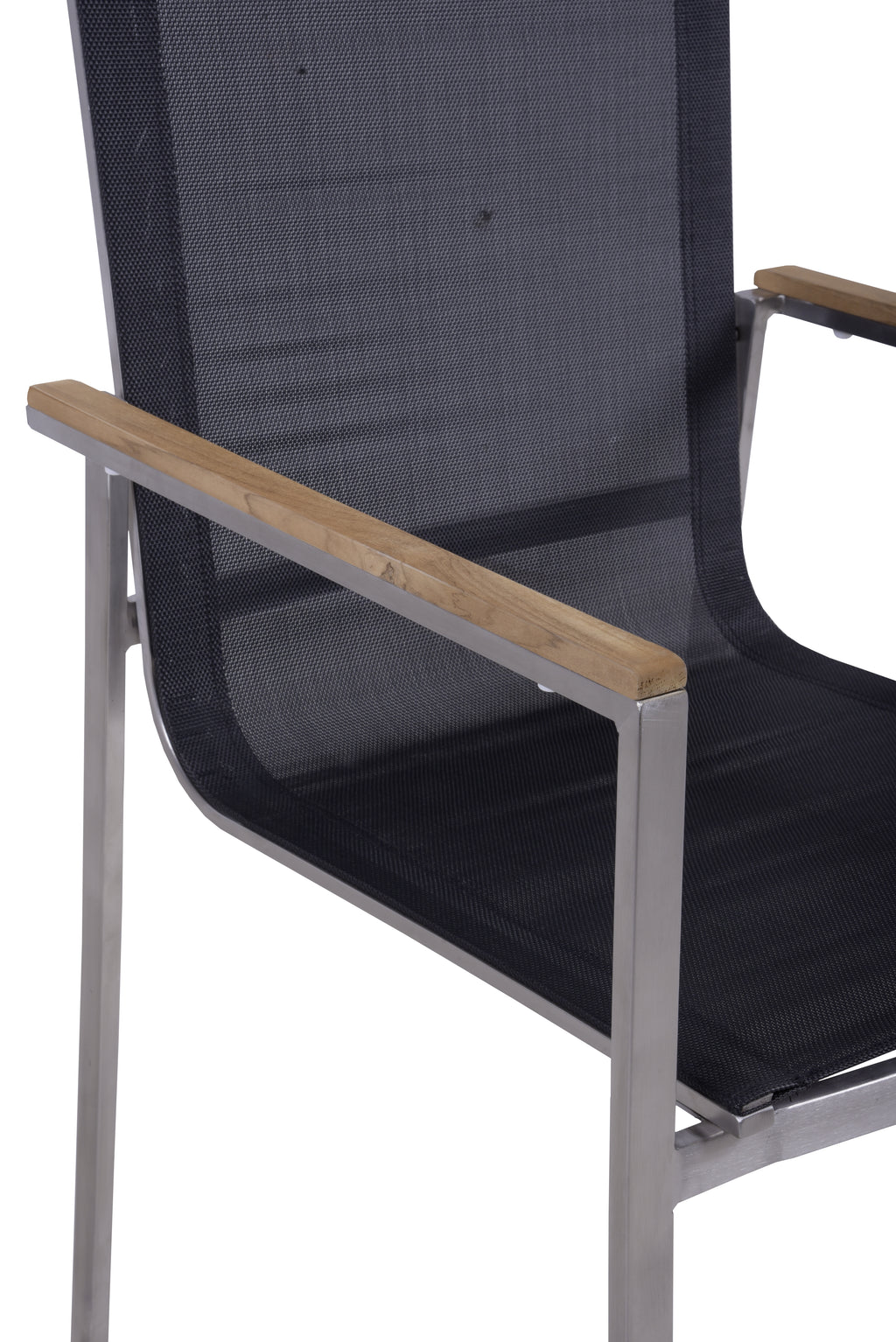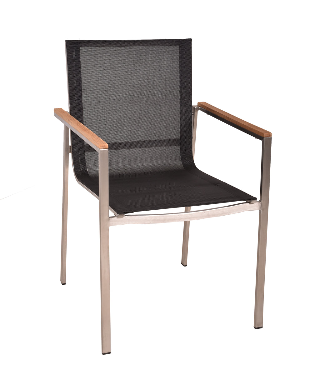 Die Materialqualität ist auf Langlebigkeit ausgelegt: Das Gestell aus gebürstetem Edelstahl 304 ist robust und rostfrei. Die Armlehnen aus FSC-zertifiziertem Teakholz bieten eine angenehme Auflagefläche, während das strapazierfähige Kunststoffgewebe absolut wetterfest ist.