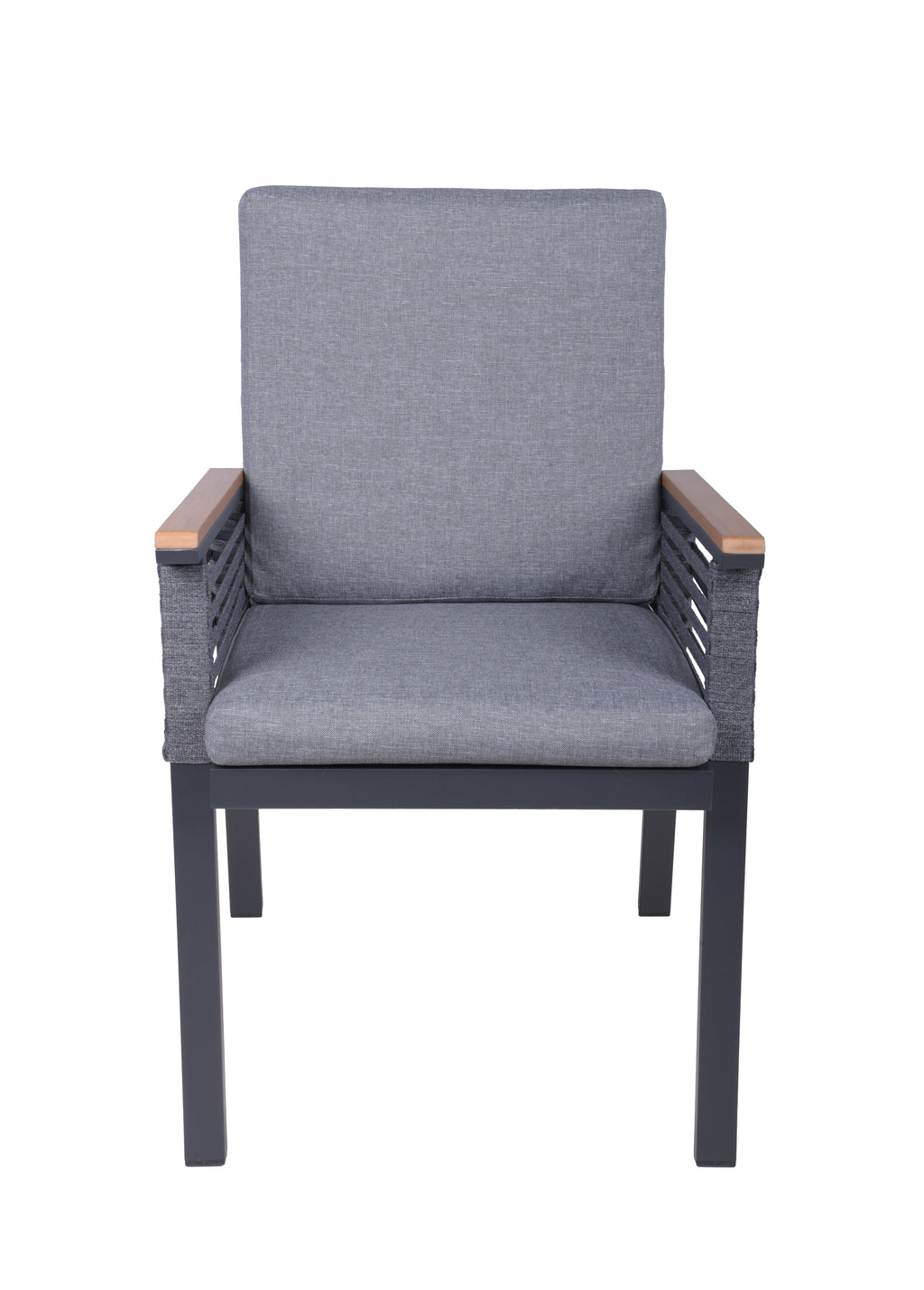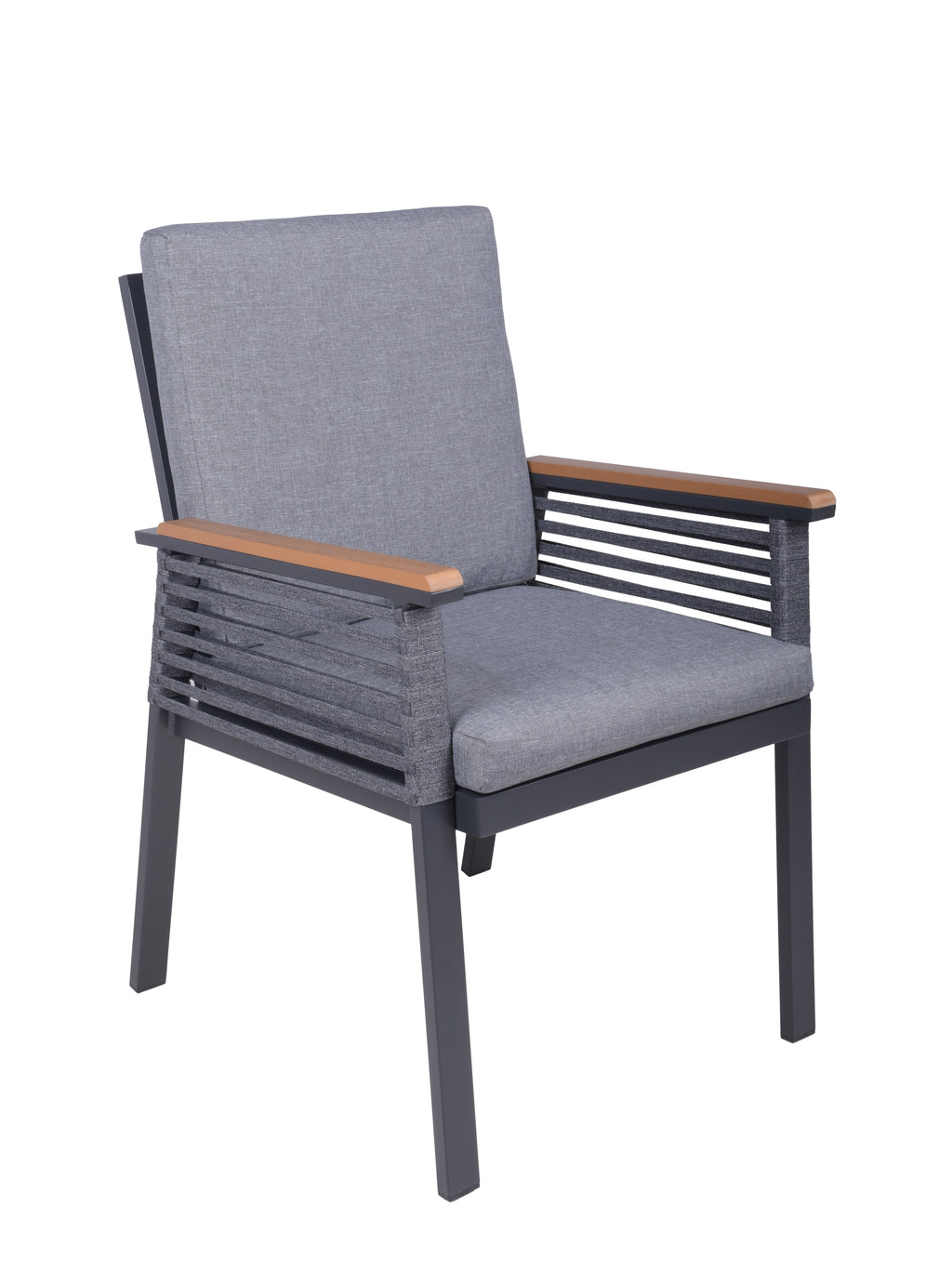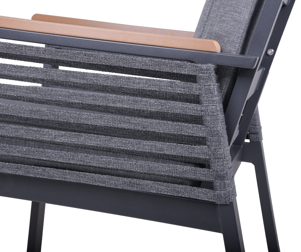 🌿 Entdecken Sie mit dem 2er Set Stühle DENIA eine neue Dimension von Outdoor-Komfort und Design. Die moderne graue Seilbespannung und das filigrane schwarze Aluminiumgestell machen diesen Sessel zu einem leichten und luftigen Highlight für jede Terrasse.