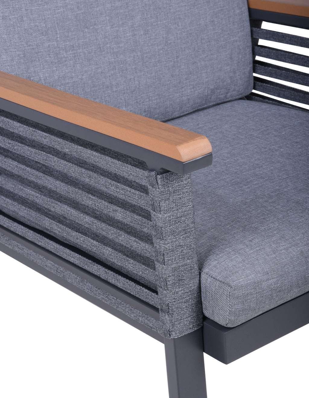 Die hochwertigen Materialien sind für eine lange Lebensdauer im Freien konzipiert. Der pulverbeschichtete Aluminiumrahmen ist rostfrei, die Olefin-Seilbespannung ist UV-beständig und schnelltrocknend, und die Polster sind für eine einfache Pflege abziehbar.