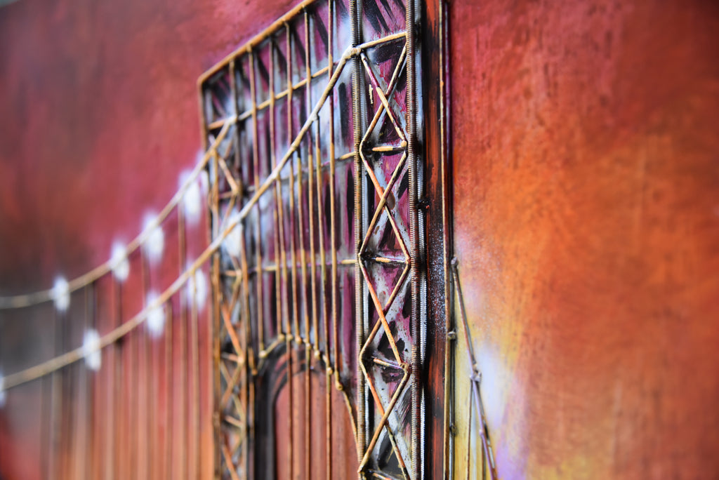 Dieses Wandbild aus buntem Stahl wurde durch aufwendige, handgefertigte Malerei veredelt. Das Vintage-Motiv mit seinem beeindruckenden Tiefeneffekt zieht die Blicke auf sich und schafft eine einzigartige, fast greifbare Atmosphäre in jedem Raum.