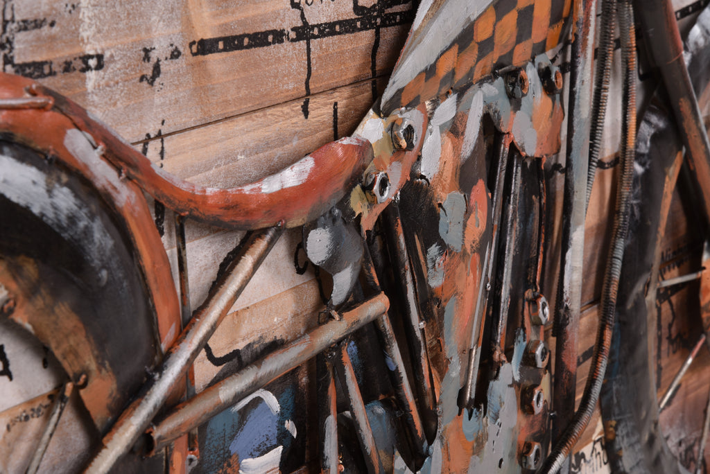 Dieses beeindruckende Kunstwerk ist auf einem robusten Holzuntergrund aus FSC-zertifizierter Spießtanne montiert, was ihm eine natürliche und wertige Basis verleiht. Die von Hand kunstvoll gemalten Elemente aus Stahl erzeugen einen faszinierenden Tiefeneffekt, der das Motorrad plastisch und dynamisch wirken lässt.