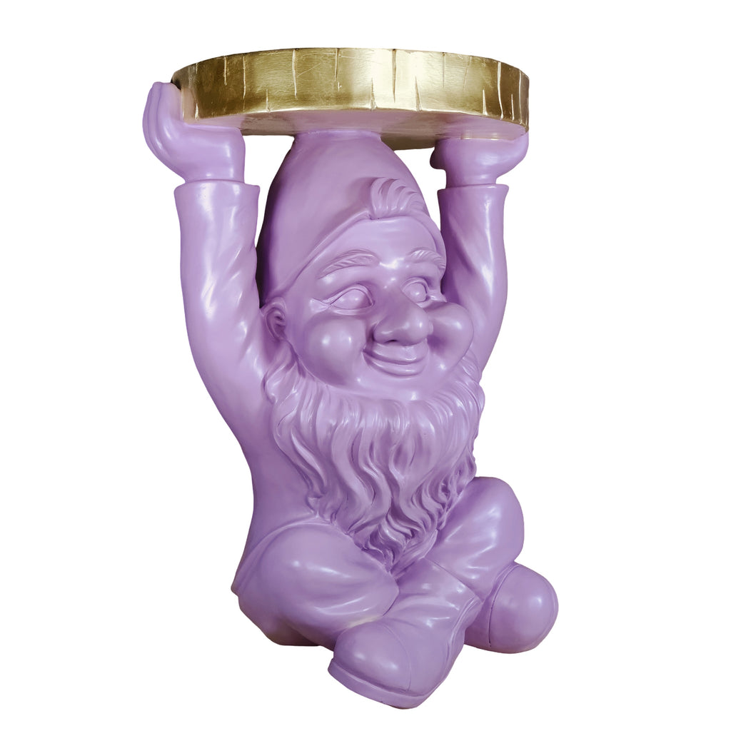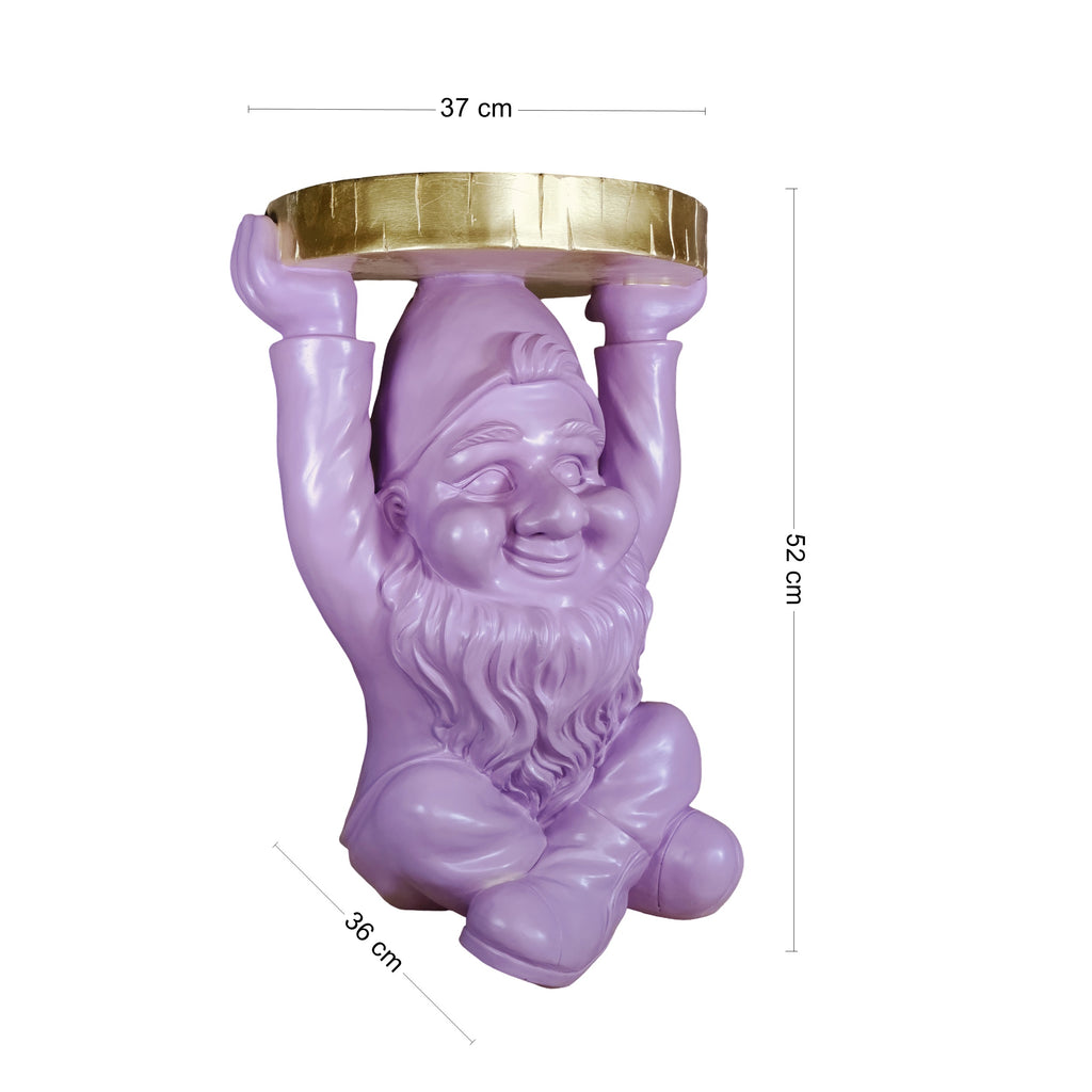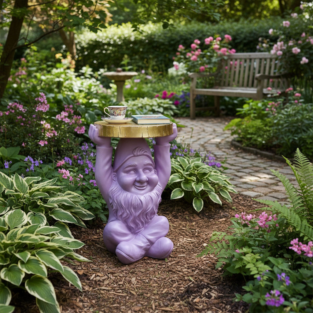 Als Beistelltisch Garten sorgt der Zwergen-Tisch auf Terrasse, Balkon oder im Wintergarten für ein stilvolles Highlight. Die runde Abstellfläche bietet Platz für Glas, Tasse, Pflanze oder Kerzen und wirkt durch den goldenen Ton besonders edel. Durch die Auswahl in Schwarz-Gold oder Lila-Gold lässt sich der Tisch passend zu modernem, kreativem oder klassischem Ambiente kombinieren.