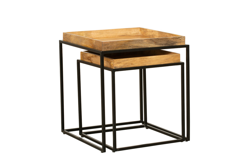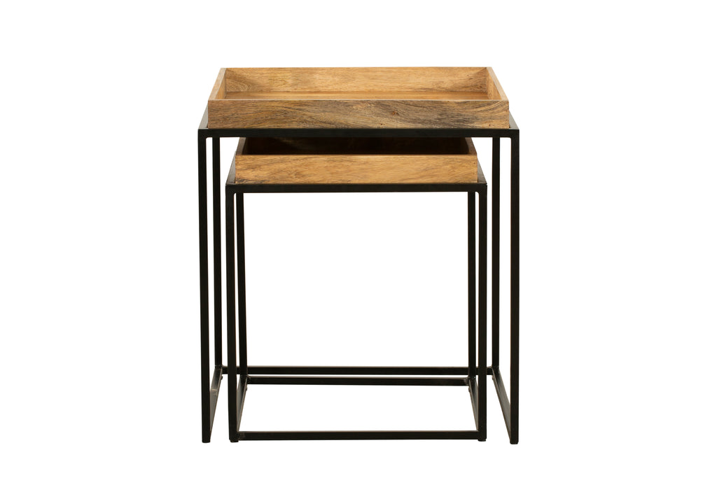 Die massiven, lackierten Holzplatten sind robust und pflegeleicht, während das schwarze Stahlgestell für hohe Stabilität sorgt. Die Tische eignen sich perfekt als Ablage für Bücher, Getränke oder Dekoration und fügen sich nahtlos in moderne und rustikale Wohnkonzepte ein. Das Set wird zur einfachen Selbstmontage geliefert.