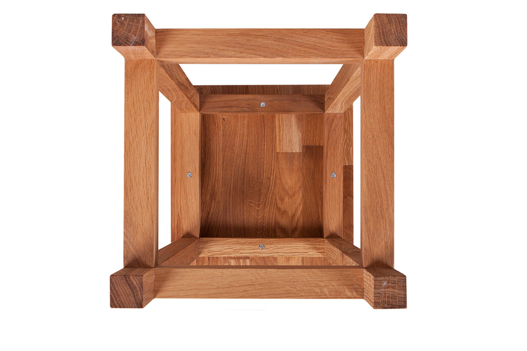 Infotext 1: Als Blumenhocker, Pflanzenständer oder Dekorationshocker ist der Hocker aus massiver Eiche vielseitig einsetzbar
