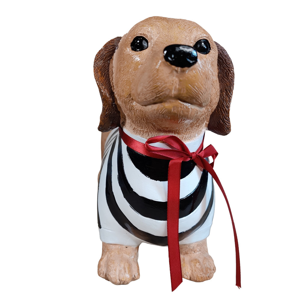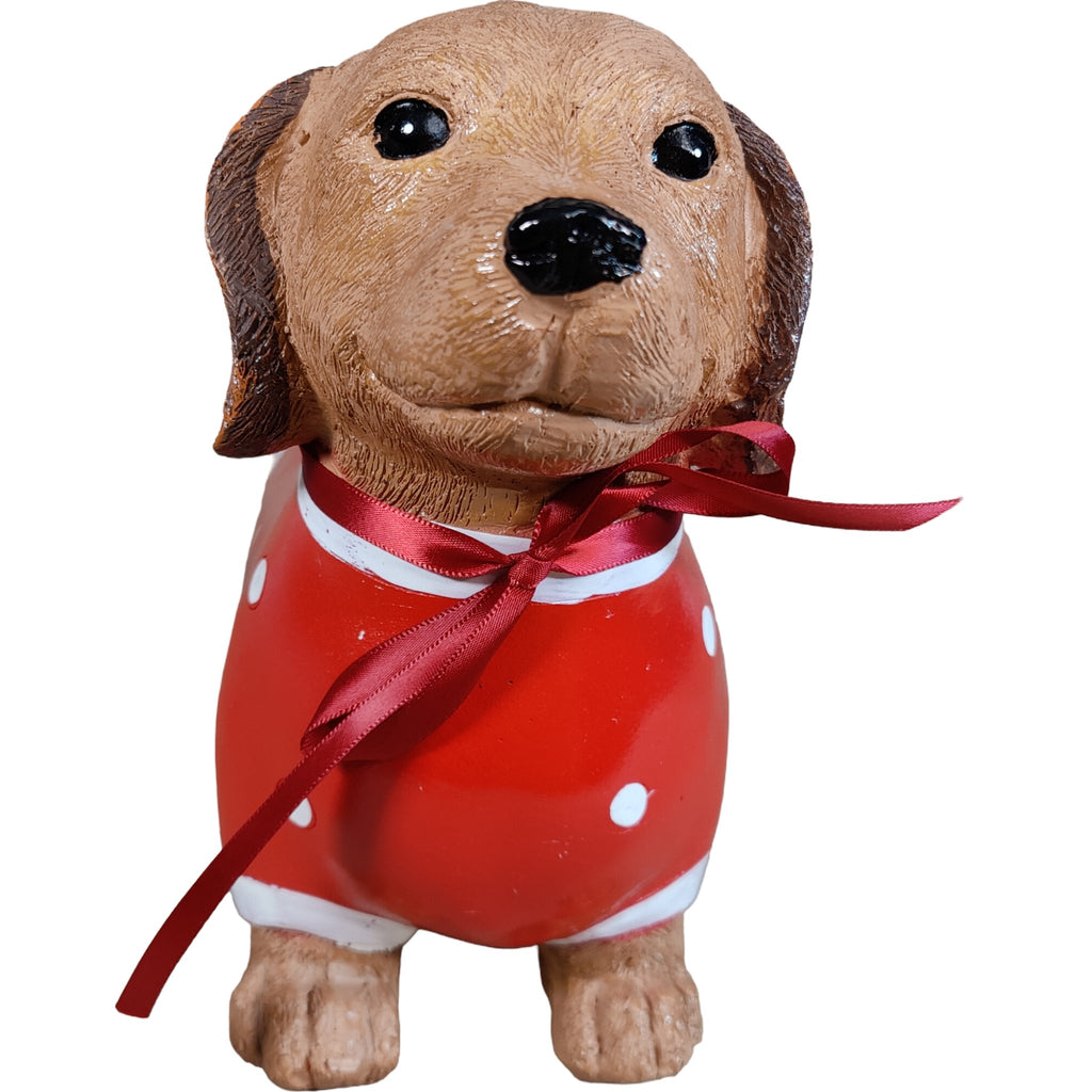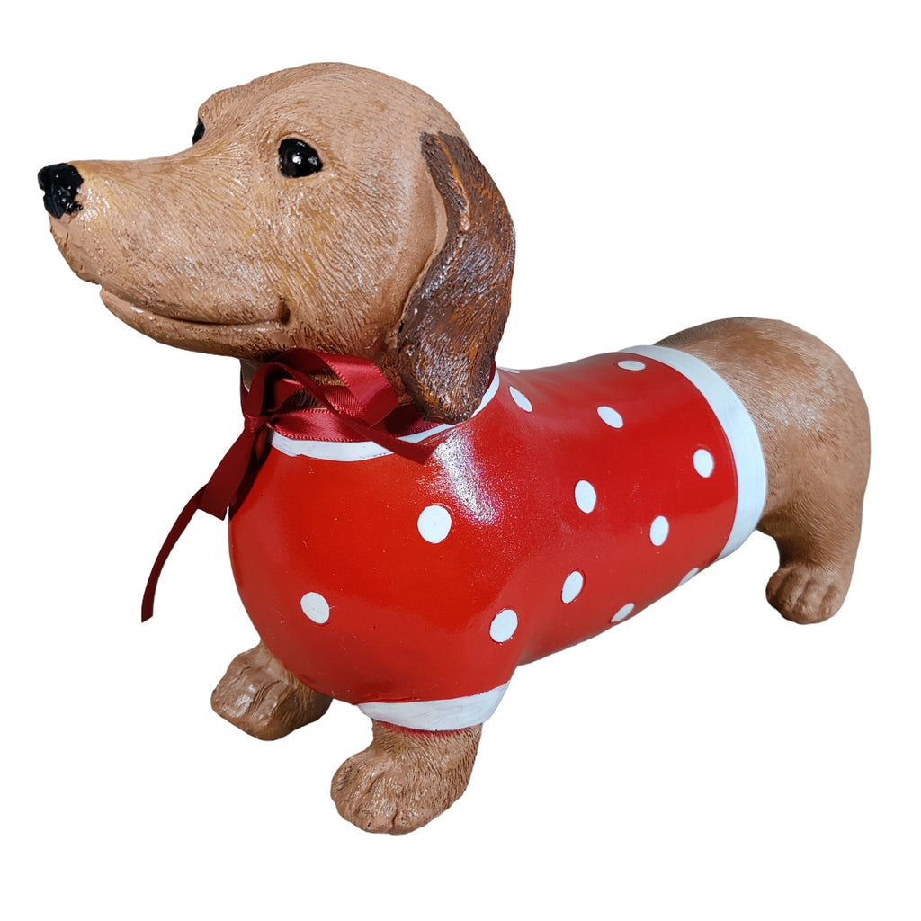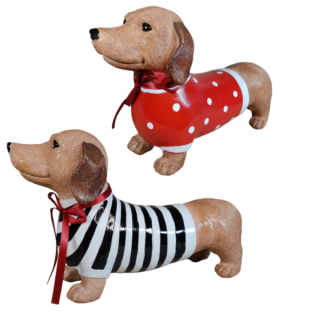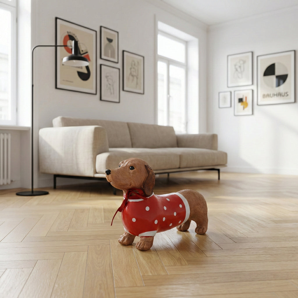 - Sofortiger Blickfang: Dackelfigur mit Pulli, Schleife und Charakter