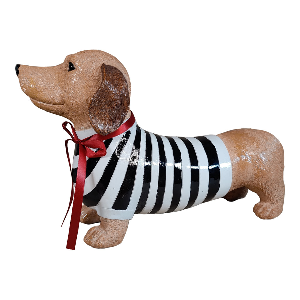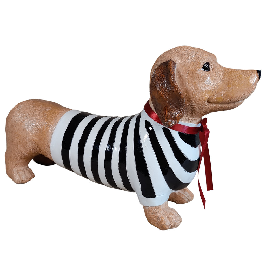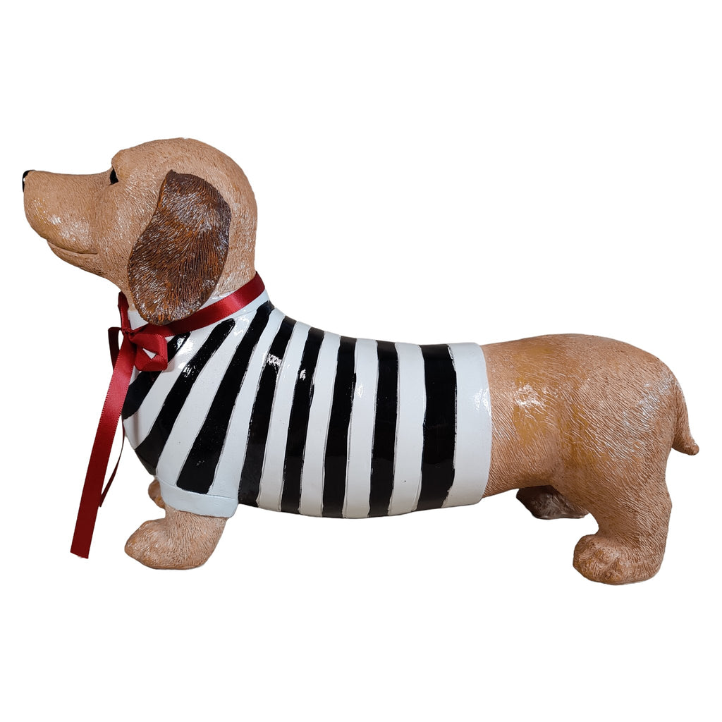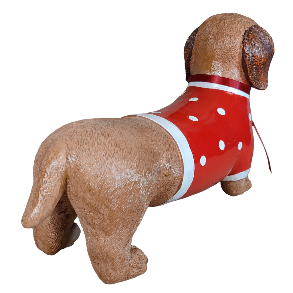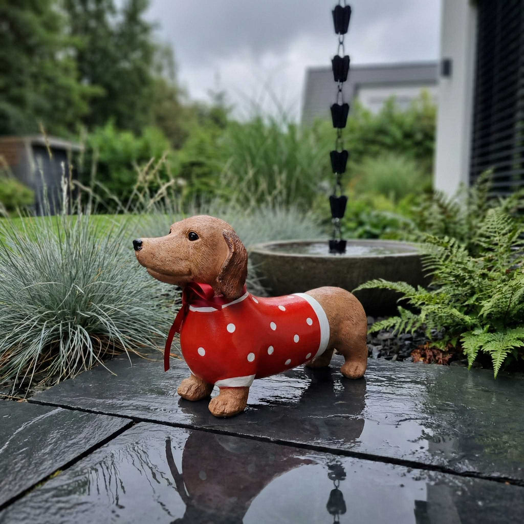 - Sofortiger Blickfang: Dackelfigur mit Pulli, Schleife und Charakter