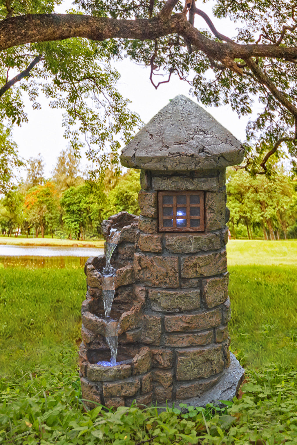 Genießen Sie das sanfte Plätschern des Wassers, während die vier integrierten LED-Lichter durch das kleine Fenster im Turm scheinen und ein warmes, einladendes Licht verbreiten. Dieser Brunnen verwandelt Ihre Abende auf der Terrasse in ein zauberhaftes Erlebnis.