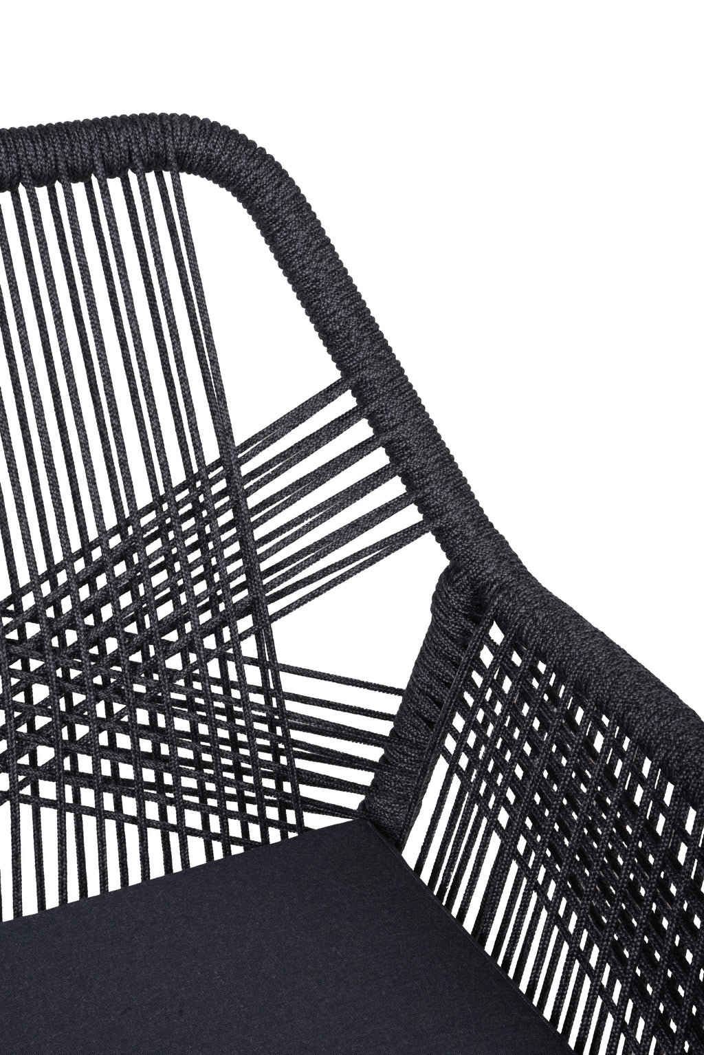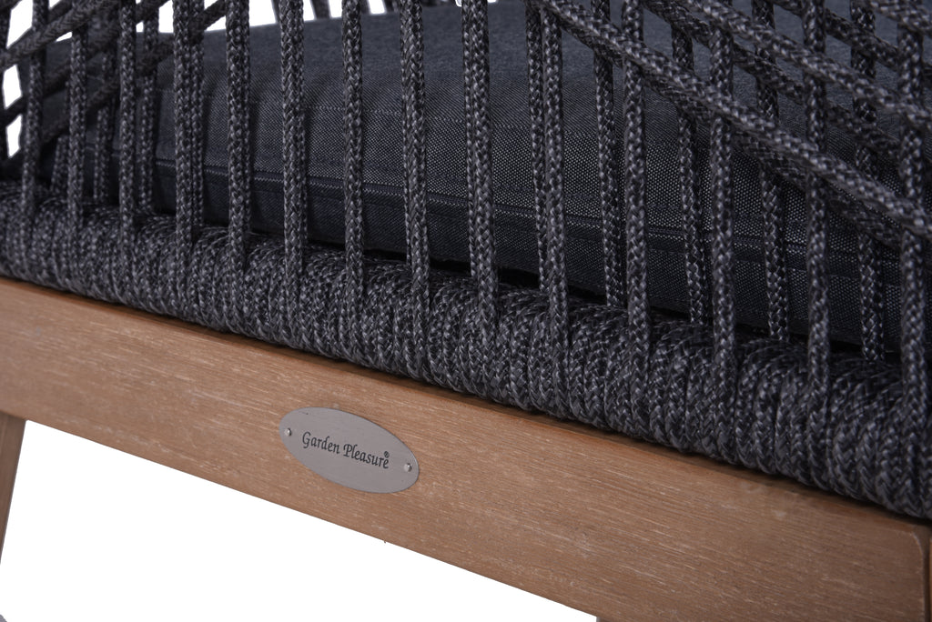 Die Sitzfläche aus einer strapazierfähigen, grauen Seilbespannung bietet nicht nur eine exzellente Optik, sondern auch einen überraschend hohen Komfort. Das Material passt sich flexibel an und sorgt für eine angenehme Sitzposition, auch bei längerem Verweilen. Abgerundet wird das Komforterlebnis durch die im Lieferumfang enthaltenen, farblich abgestimmten Sitzauflagen aus grauem Polyester.