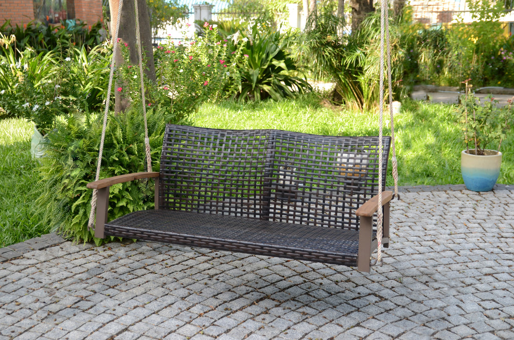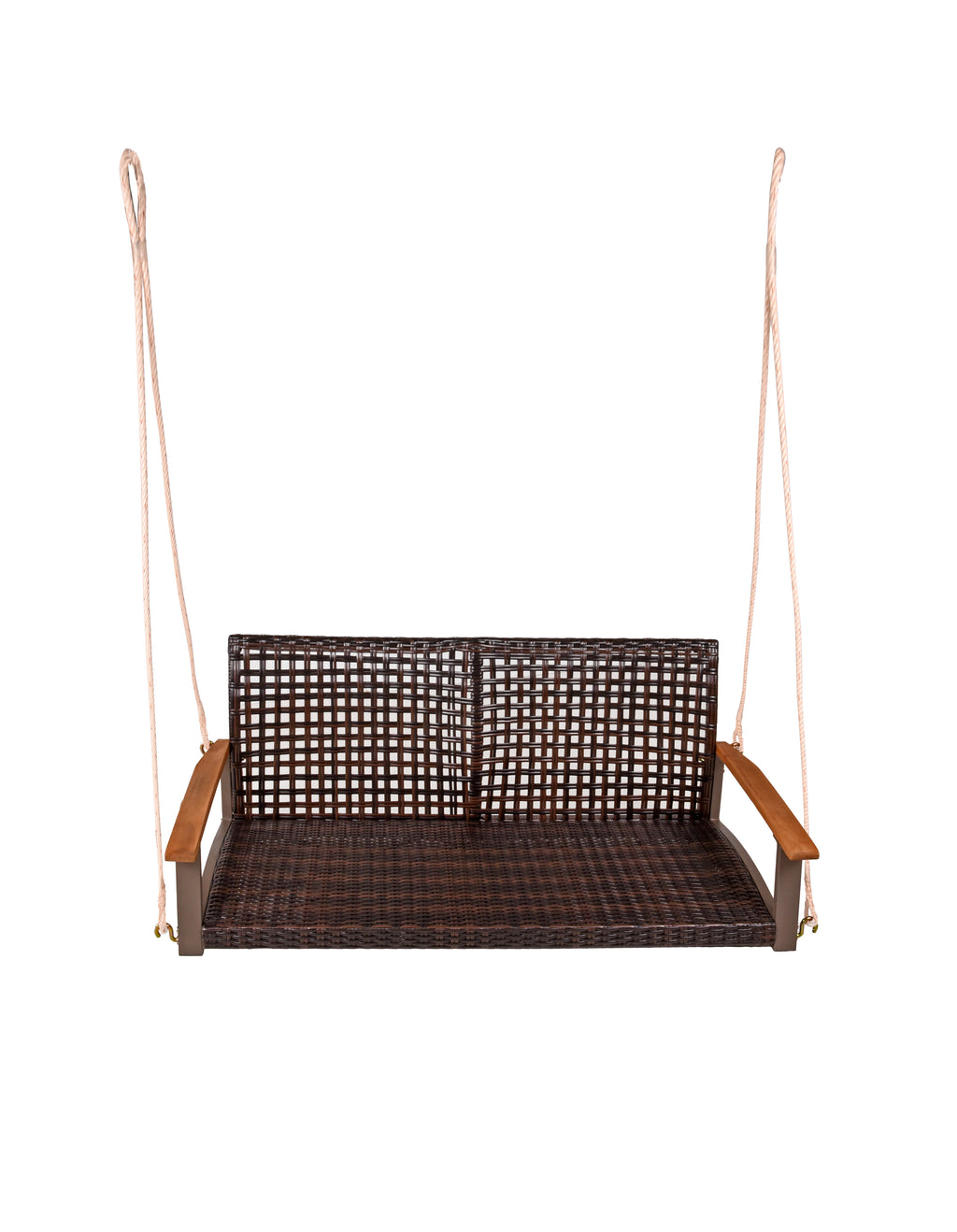 Stellen Sie sich vor, wie Sie an einem lauen Sommerabend sanft hin und her schaukeln und den Tag ausklingen lassen. Die bequeme Sitzfläche aus braunem Kunststoffgeflecht und die praktischen Armlehnen aus Akazienholz bieten höchsten Komfort für zwei Personen.