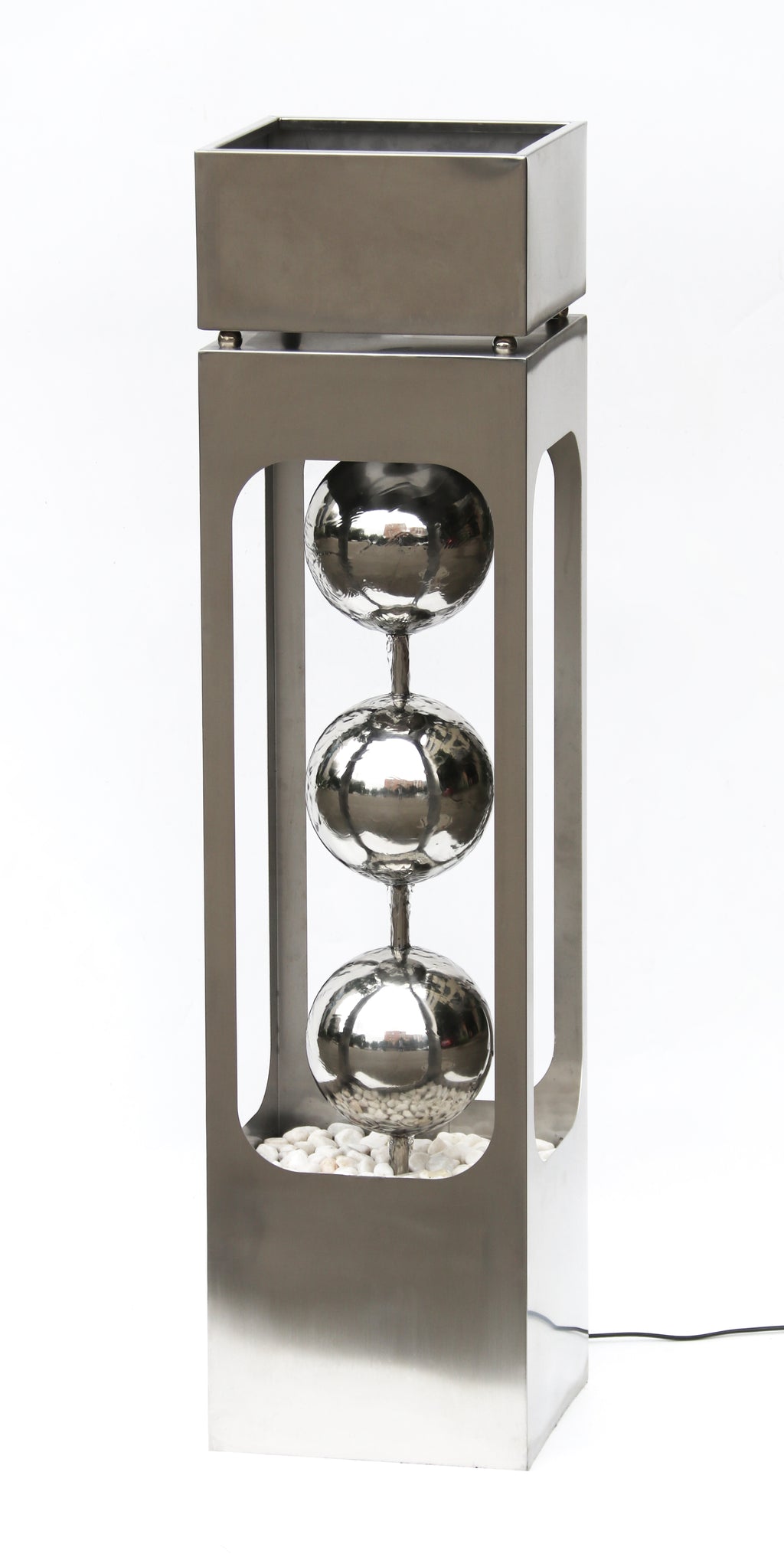 Stellen Sie sich vor wie das Wasser sanft über drei glänzende Stahlkugeln in ein Bett aus weißen Ziersteinen fließt während in der oberen Schale Ihre Lieblingsblumen blühen. Diese Säule ist nicht nur ein optischer Genuss sondern schafft auch eine Atmosphäre der Ruhe und Entspannung ein Fest für Augen und Ohren.
