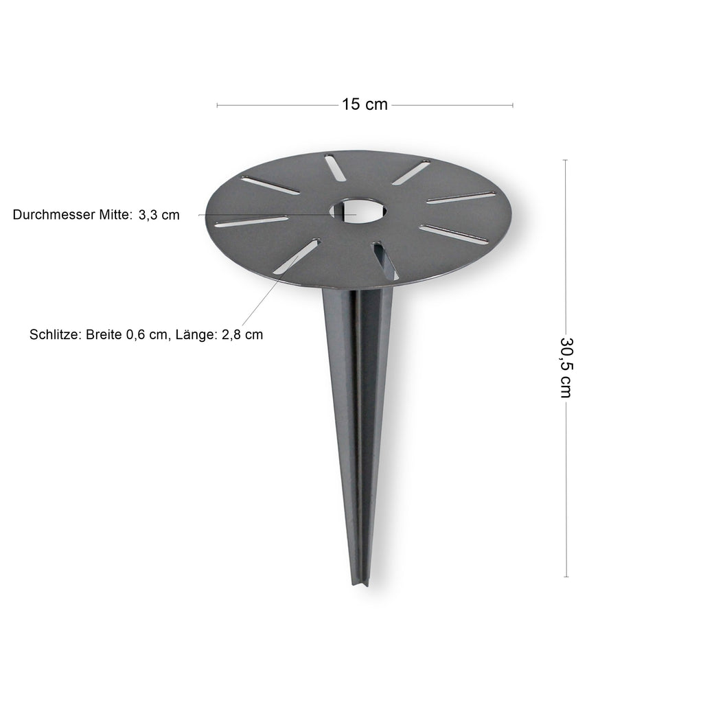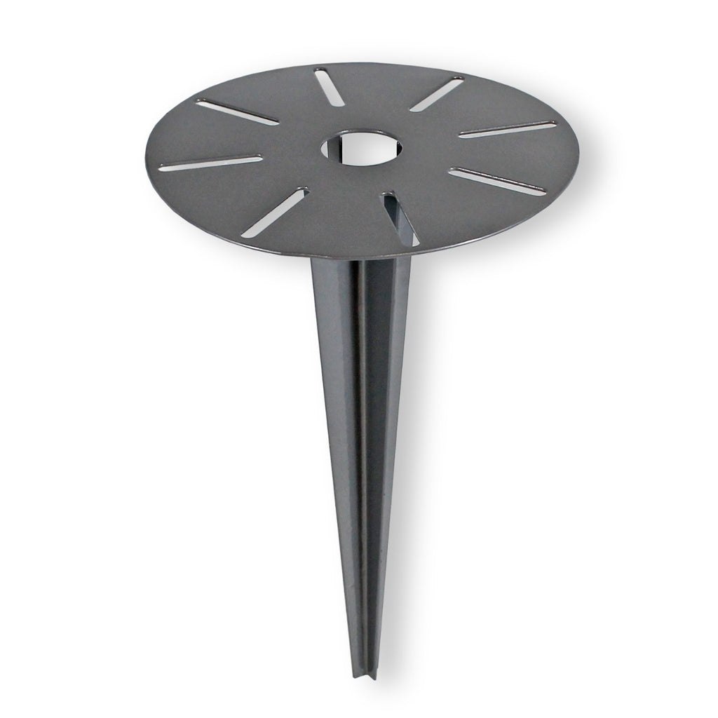Besondere Eigenschaften: kompakter Bodenteller, 8 Langlöcher zur flexiblen Befestigung, zentrale Kabeldurchführung, stabiler Einschlagspieß
